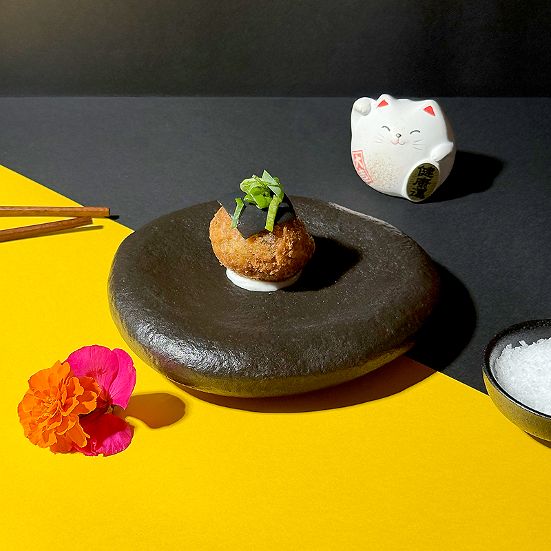 Rice croquette with eggplant “Yu-Xiang”, covered with an aubergine veil.