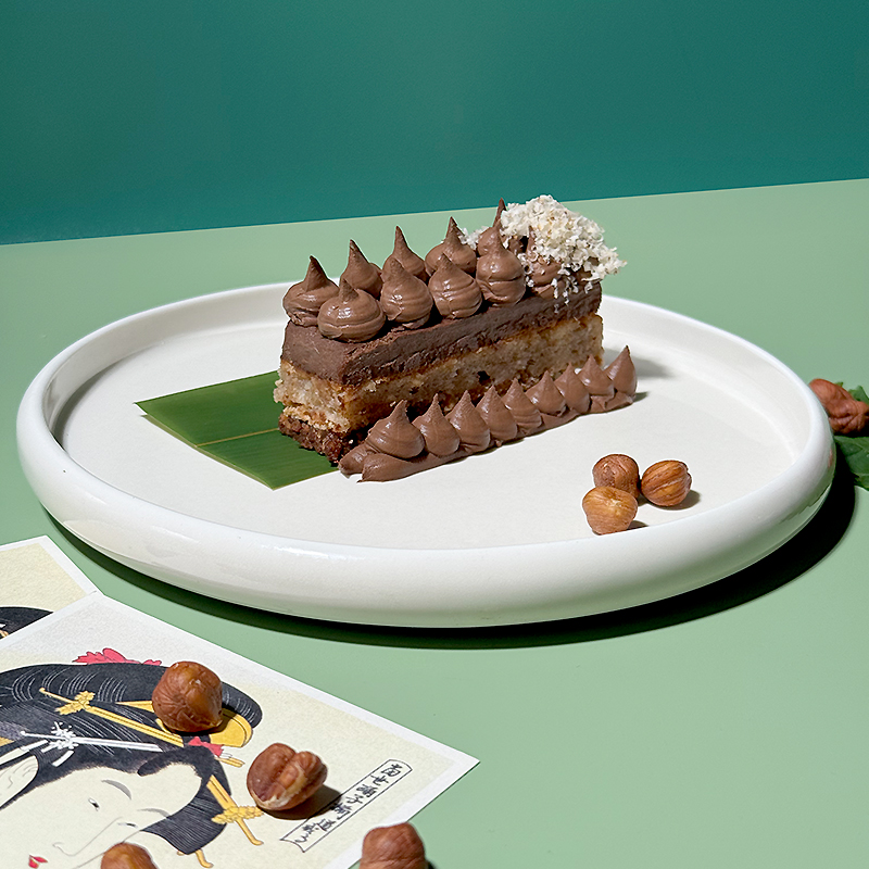 Fluffy mandarin sponge cake with creamy yuzu, mango, and coconut mousse. A fresh and exotic balance of citrus flavours and tropical fruits.