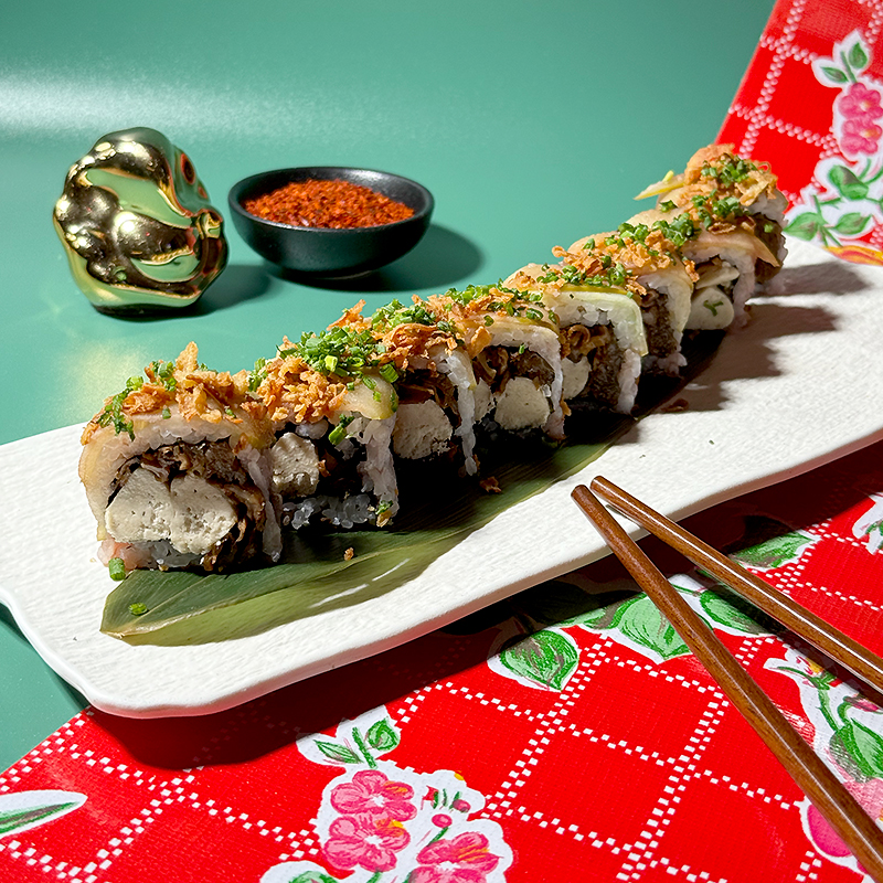 Simply the best uramaki sushi roll with traditional sushi rice, nori seaweed, roasted eggplant, marinated tofu, cucumber, kimchi, satay sauce, and crispy rice paper.