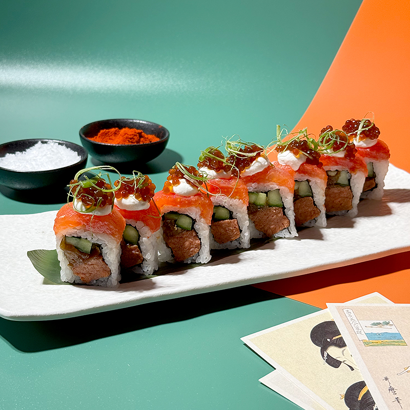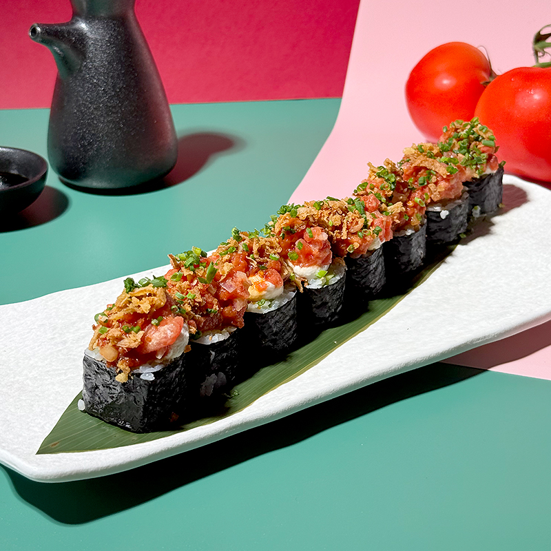 A summery and creamy Futomaki filled with avocado and homemade fermented cheese. Finished with tomato tartare, teriyaki sauce and crispy onion on top.