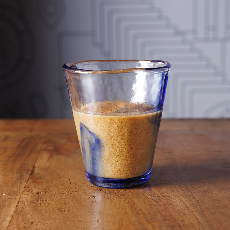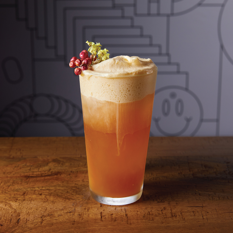 Té chai con espuma de leche de coco y fruta de la pasión.