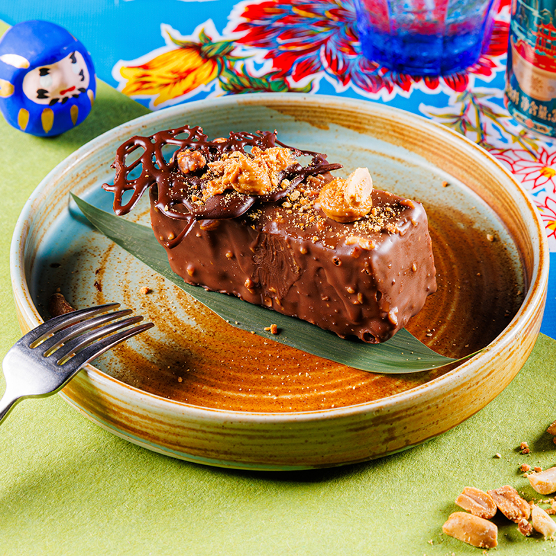 Lingote crujiente de chocolate y avellana con relleno cremoso y praliné de avellana.