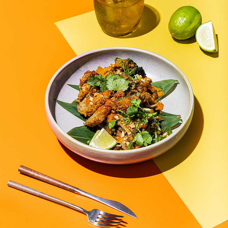 Tallarines de arroz salteados con zanahoria, brócoli, brotes de soja, salsa de tamarindo, cacahuetes, salsa satay y tonkatsu de seitán.