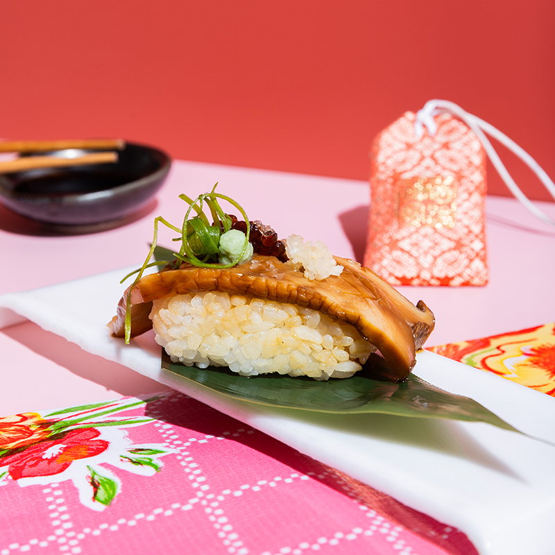 Niguiri de setas cardo marinadas en tamari, queso de anacardo fermentado, caviar de tapioca y jengibre.