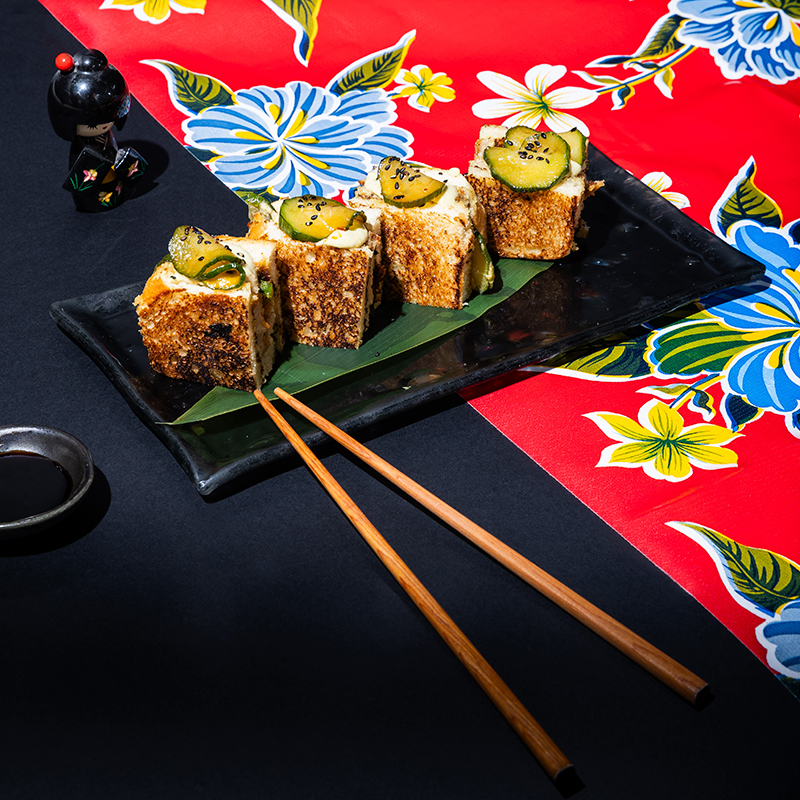 Simplemente el mejor rollo de sushi uramaki con arroz de sushi tradicional, alga nori, berenjena escalivada, tofu marinado, pepino, kimchi, salsa satay y crujiente papel de arroz.