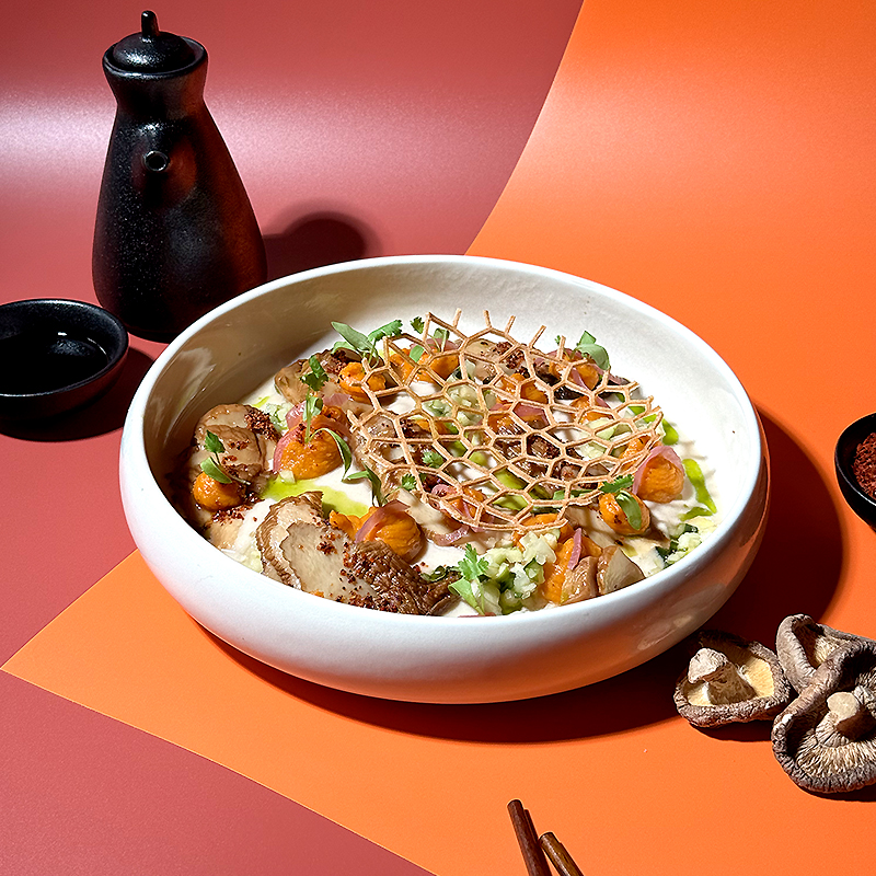 Ramen de noodles caseros, con caldo cremoso a base de dashi y leche de coco , tofu estilo sichuan, choysum al wok , alga nori y espuma de coco salado.