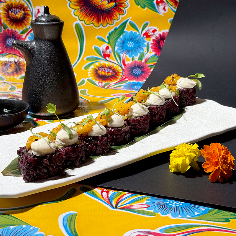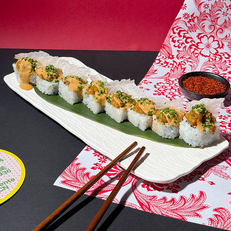 Un Uramaki versión tropical, relleno de mango, aguacate y tofu crujiente, acabado con queso crema fermentado casero y tartar de mango picante.