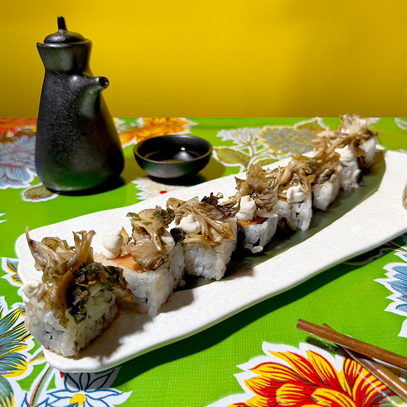 Uramaki relleno de boniato asado, maitake salteados al wok, queso de anacardo fermentado y chimichurri asiático.