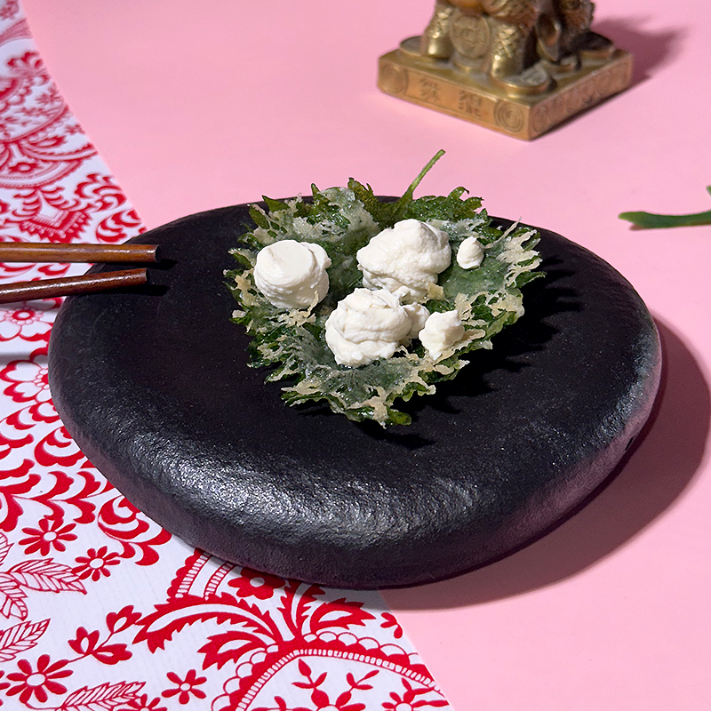 Hoja de shiso crujiente acompañada de queso de anacardo fermentado.